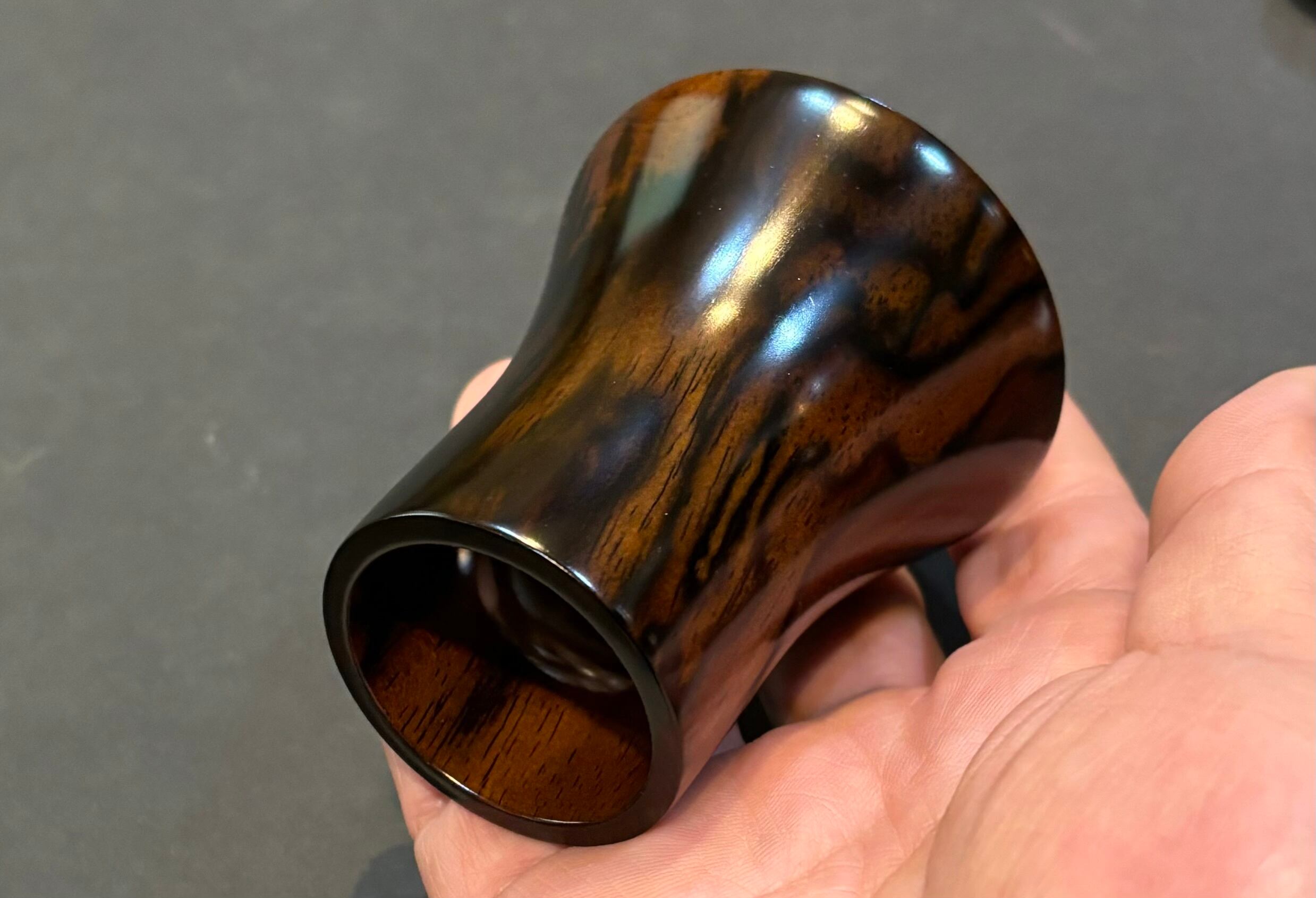 仕上げの拭漆では黒柿の道管を完全に塞いでいます。これは口当たりを良くする為と強度を重視した為です。