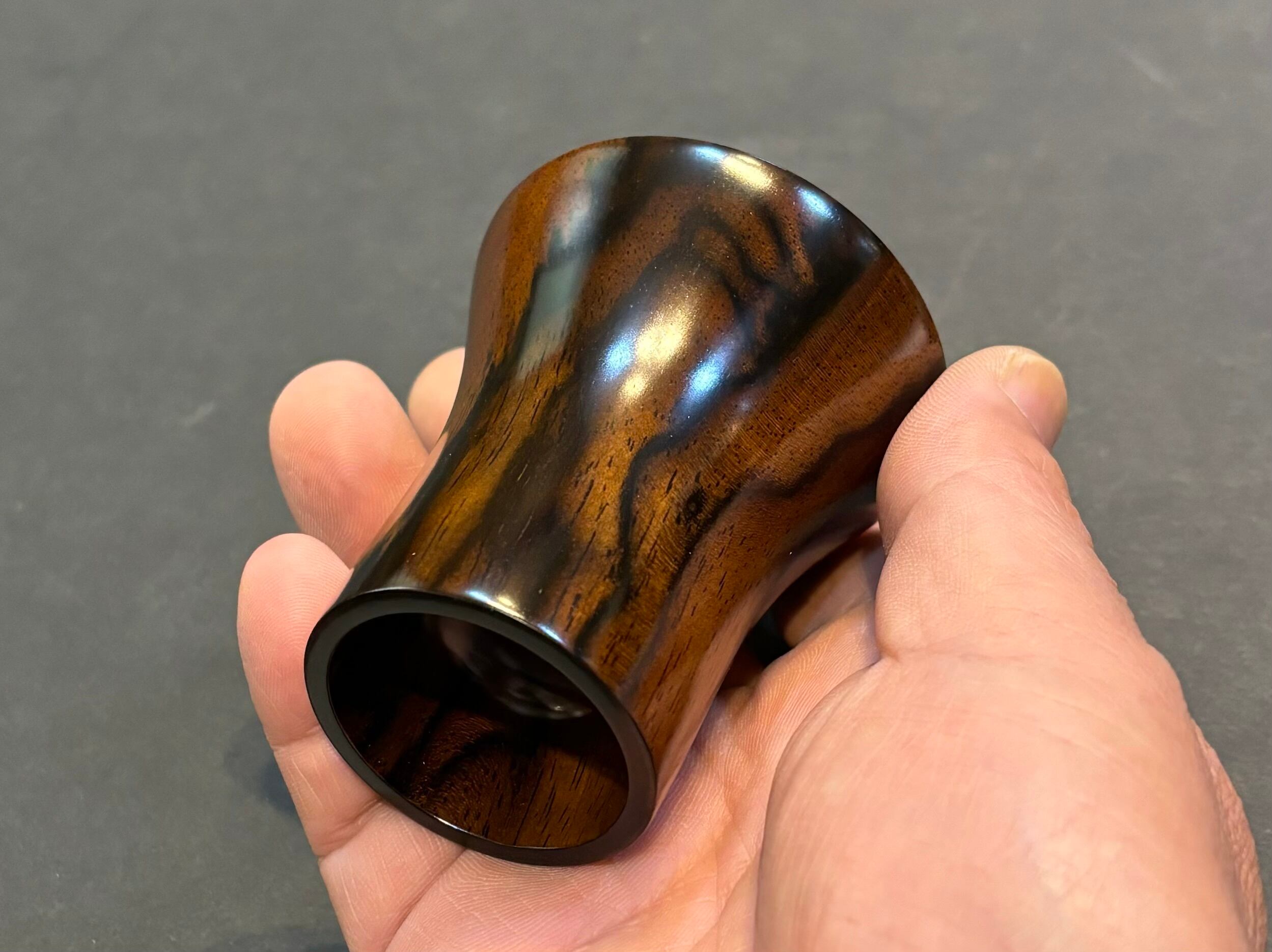 仕上げの拭漆では、黒柿の導管を完全に塞いでいます。これは口当たりを良くする為と強度を重視した仕上げです。