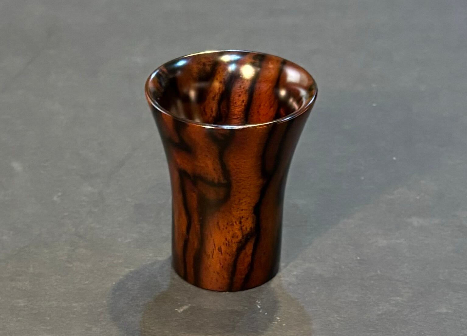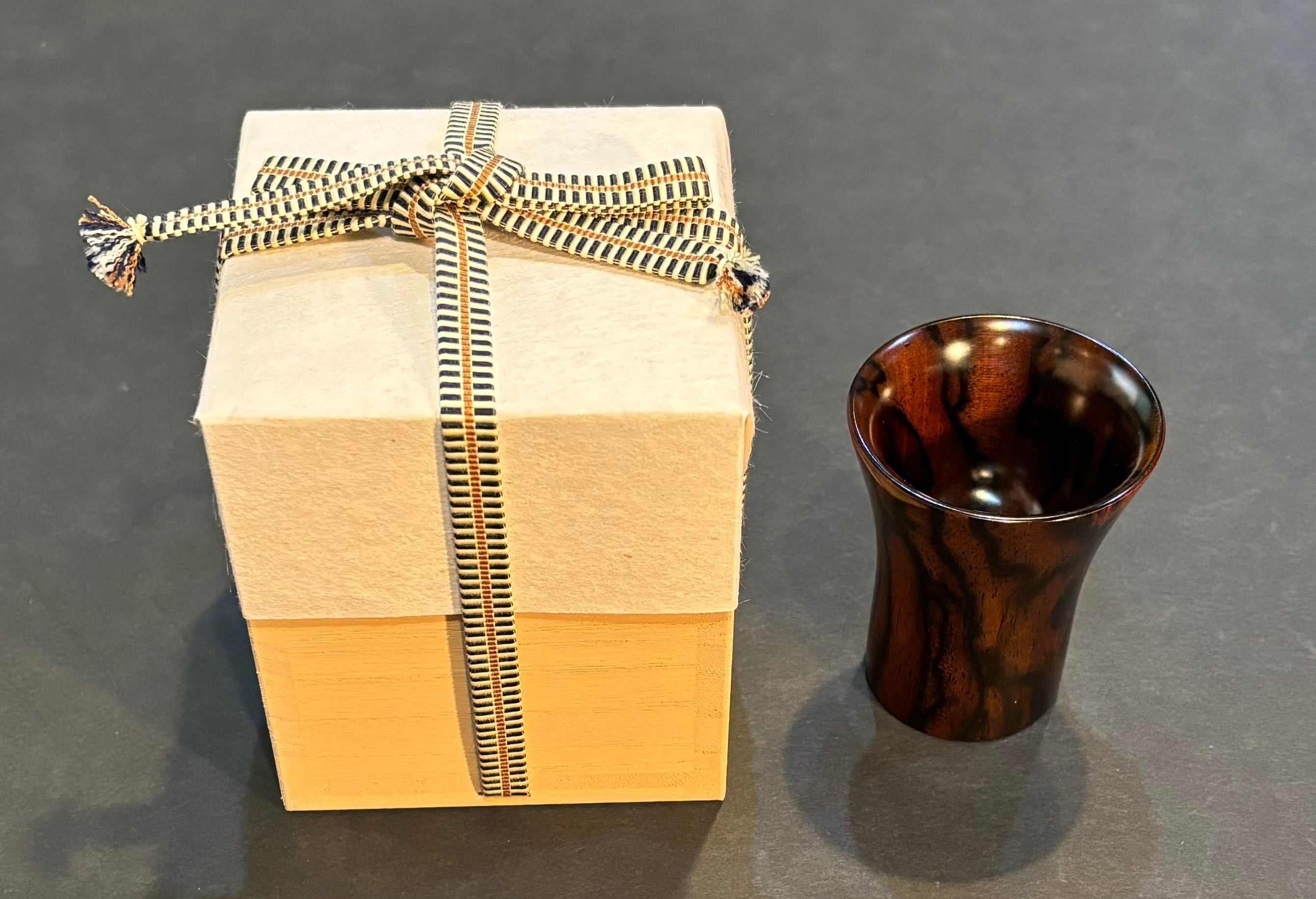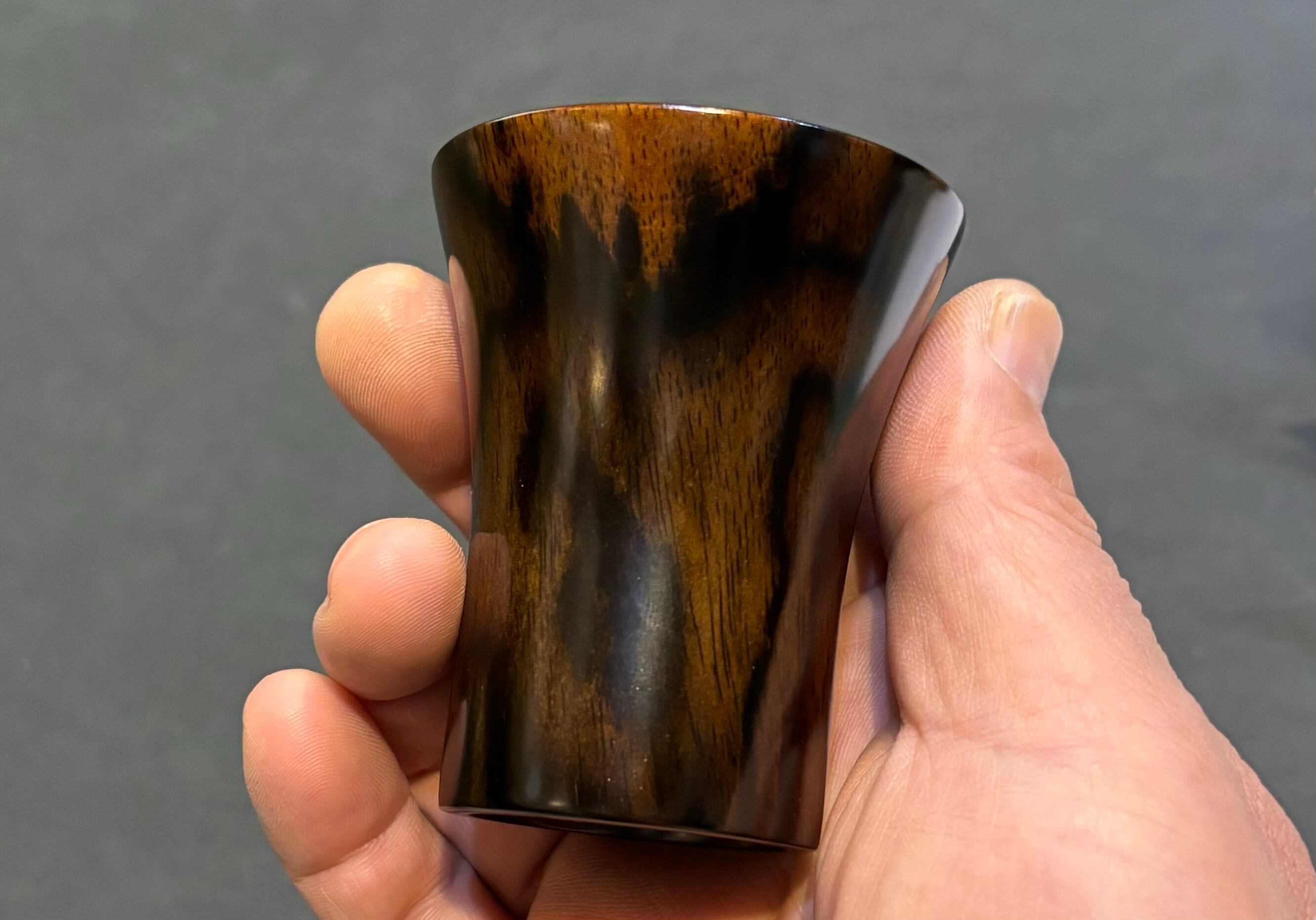 十数回にわたり漆を塗り重ね、研ぎ上げたことで、黒柿の質感とともに、口当たりの心地よさをお楽しみ下さい。