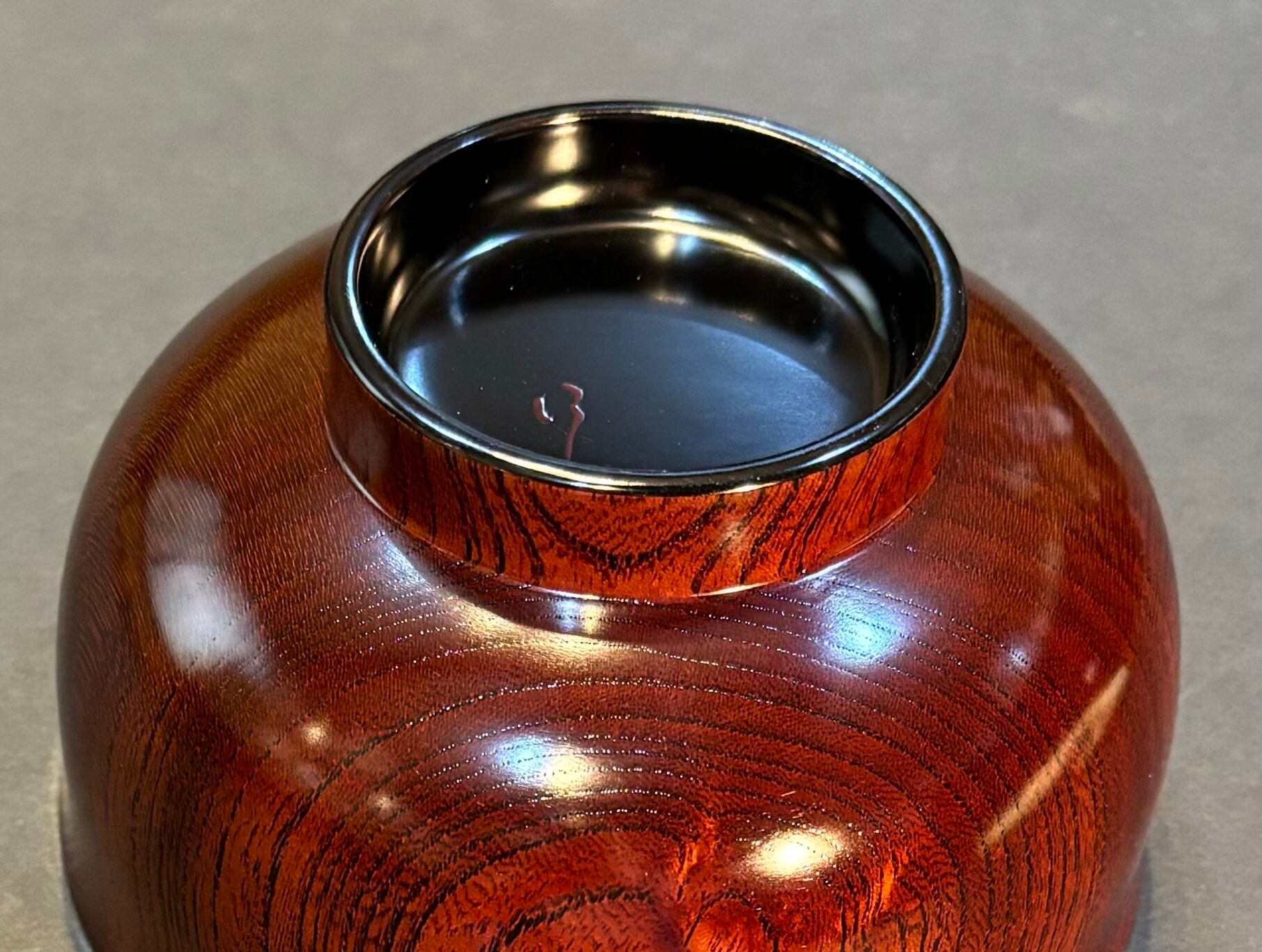 強度と美しさを考えて中塗りの段階で煮沸し、その後内側は黒漆を塗り重ね、外側と同じ様に拭漆を塗り研ぎを丁寧に繰り返し仕上げています。